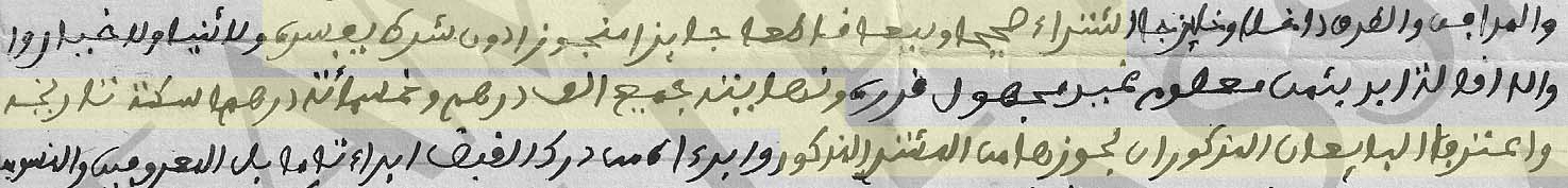 This part of the ownership contract states that the purchase made by Kassi Lhoussine was done properly and authentically, without any specific conditions, and the purchase price of all the properties, as mentioned in the contract, was 1500 dirhams (as valued 1962). The sellers, obviously,  admitted that they were in possession of such a purchase price.