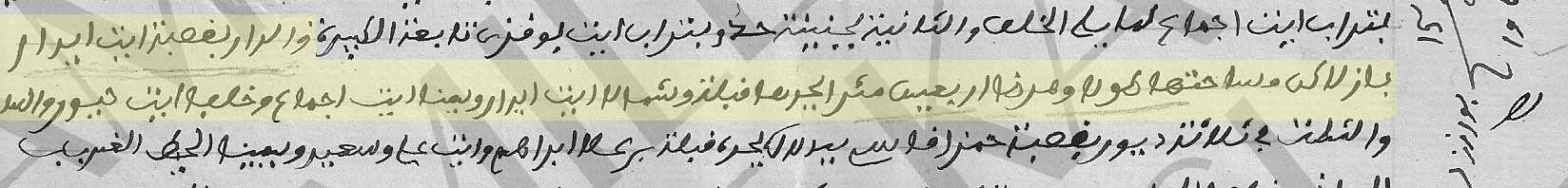 This part of the ownership contract mentions the property that Kassi Lhoussine bought from Avraham and Jacob Ouazana, and gives the following details: Length: 40 meters, breadth: 40 meters (1600 square meters). This area was suronded, on the north, by Ait Idar, and on the right by Ait Oujmaa and At Jabbor and the fence behind.