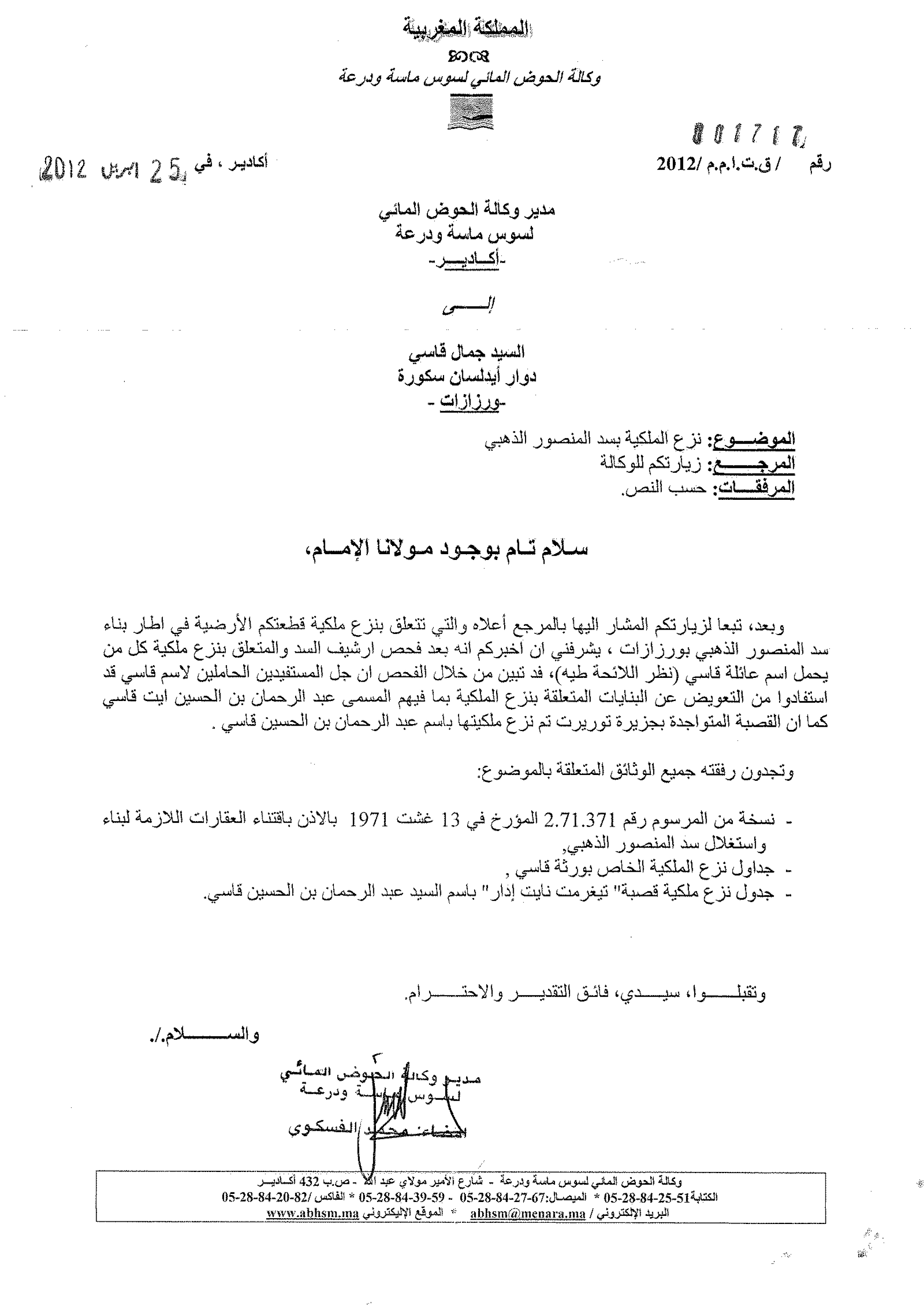 A correspondence from the Director of Water Resources Agency of Souss Massa Daraa region to Jamal Kassi on the 25th of April 2012 says that it has been verified that all the people holding the name of  Kassi benefited from the compensation made in return for the expropriation mention above including El Houssine Abderrahman Kassi. Also, the Kasbah under discussion “here was expropriated” in the name of Aberrahman Kassi.